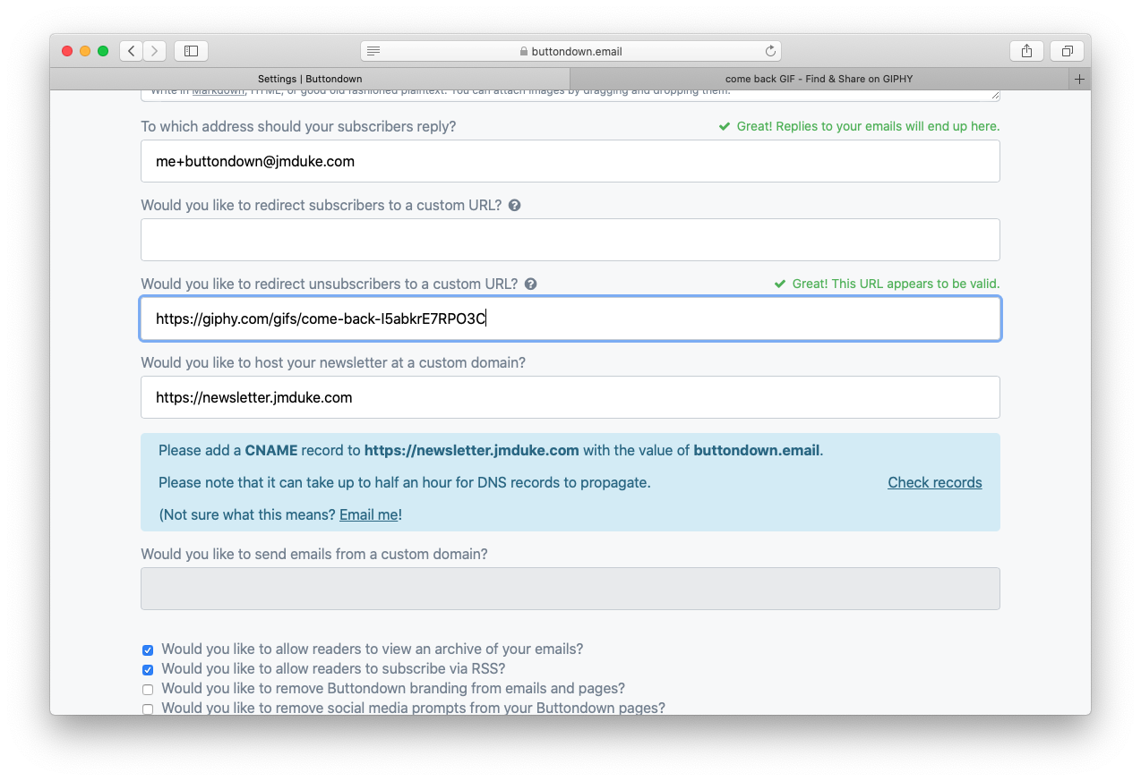 Sometimes, though, people unsubscribe. Buttondown gives them a curt and plain exit survey asking them why they unsubscribed, but you can now override that default with a link of your choice.