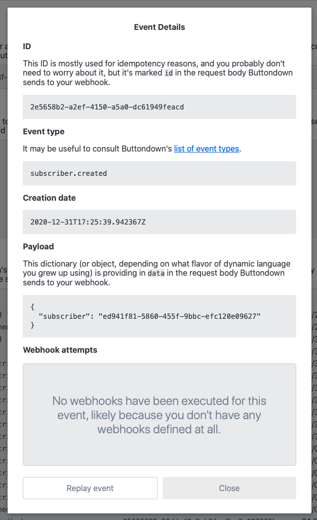 So, if you’re not interested in supercharging your newsletter (and I don’t mean that in a bad way at all: none of my newsletters are using webhooks!) feel free to ignore this. But if you’re interested in seeing how to better integrate Buttondown into your stack, let’s dive in!