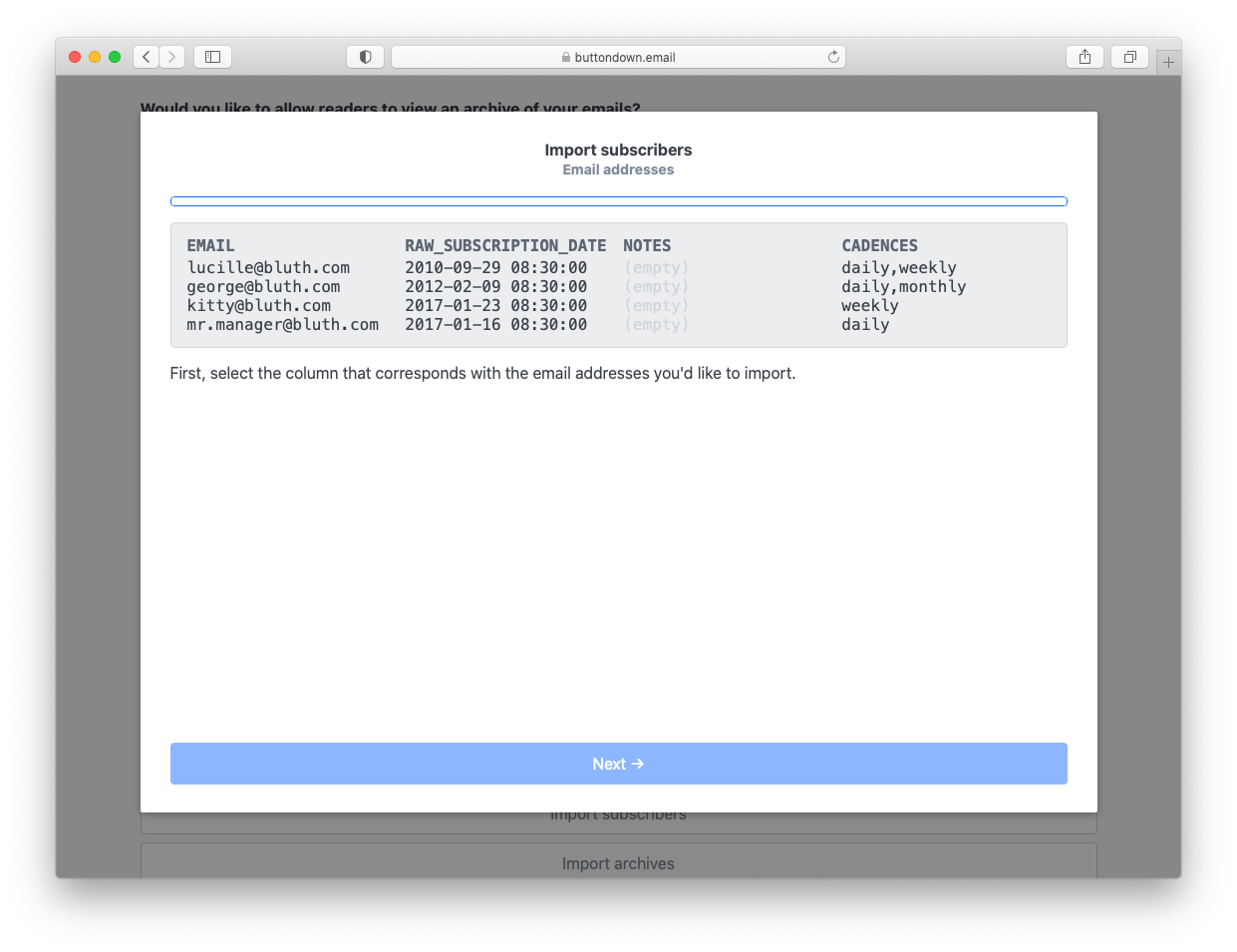 Why is this strange and unhelpful to write about? Because if you’re reading this blog you are either a Buttondown user already — and you have no need for importing — or you’re not a Buttondown user — and your decision to use Buttondown is likely not going to be swayed by its data onboarding capabilities.
