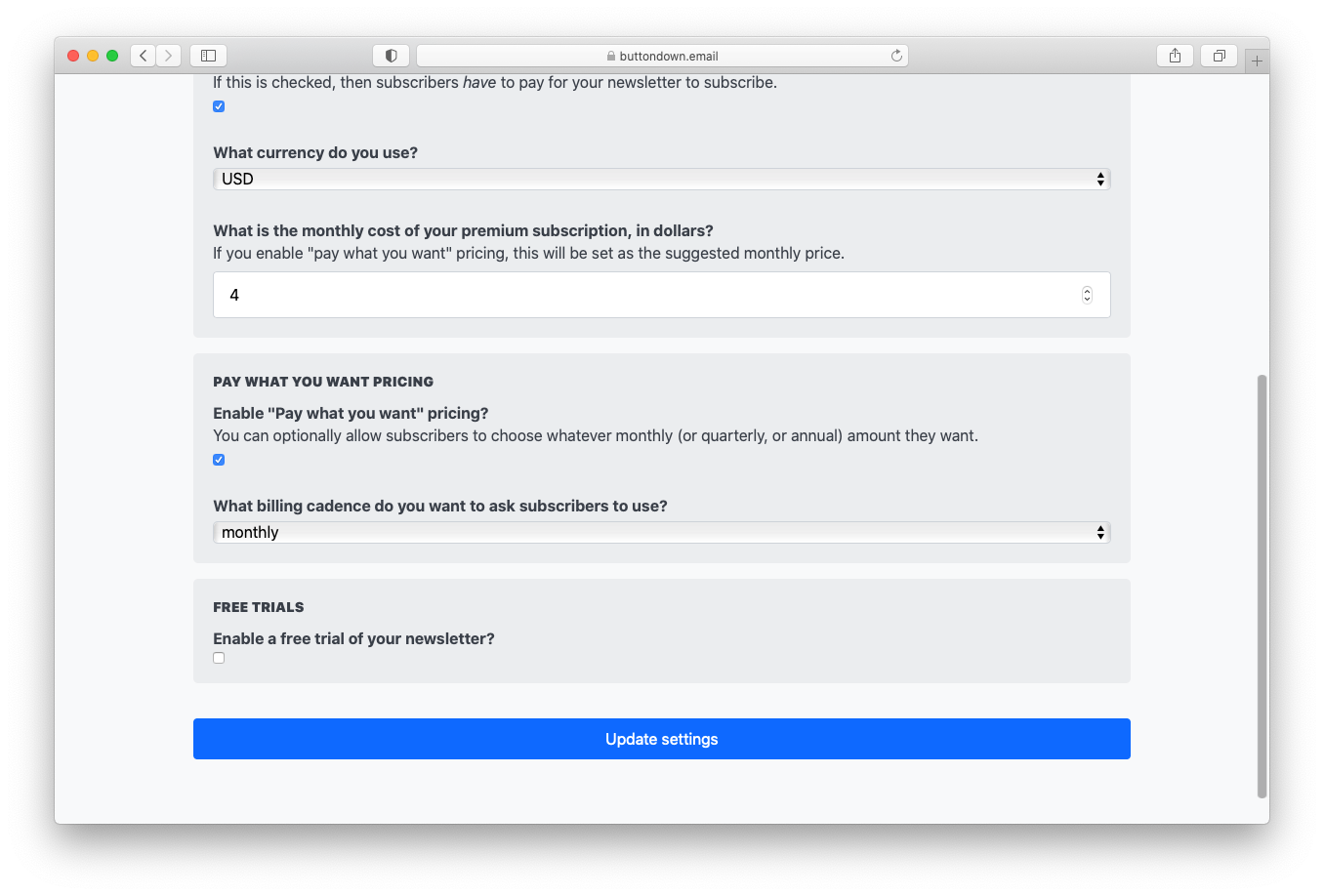 Setting it up is fairly easy; you go to your Paid Subscriptions page, hit the ol’ checkbox, choose a cadence, and you’re off to the races.