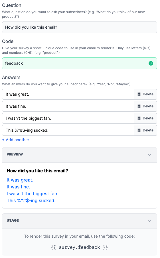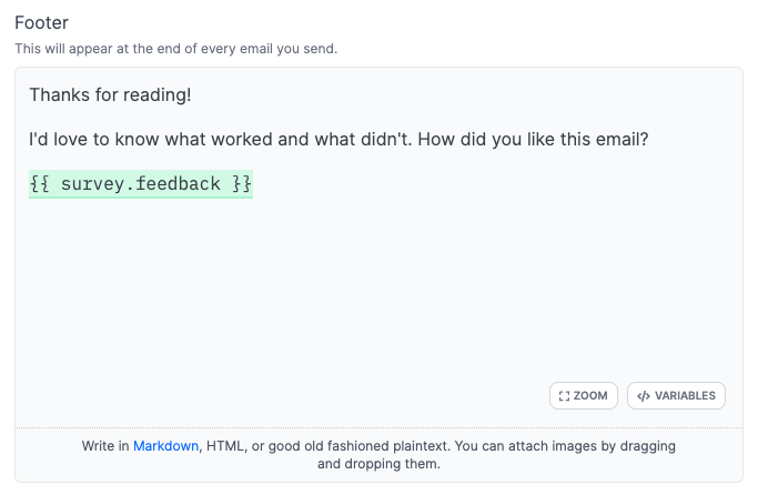 Folks love surveys. And now you can add a survey to the end of every email you send with Buttondown.