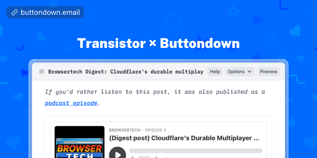 Enter Transistor — a delightful podcast hosting platform that we've integrated with. You can now drop your Transistor share link right into Buttondown and we'll automatically embed the podcast player in your email. Just like other audio integrations we have (such as Soundcloud), Buttondown makes both an "email-friendly" version of the embed and a "web-friendly" version to maximize your subscriber experience without any broken iframes or confused clients.