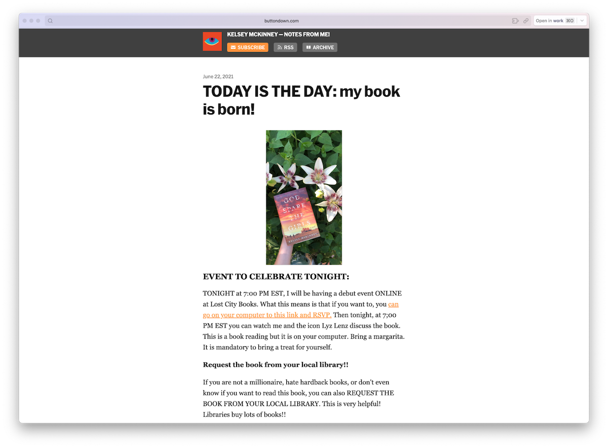 In Kelsey McKinney’s day-of newsletter, she explained how subscribers could request her book at their local library.