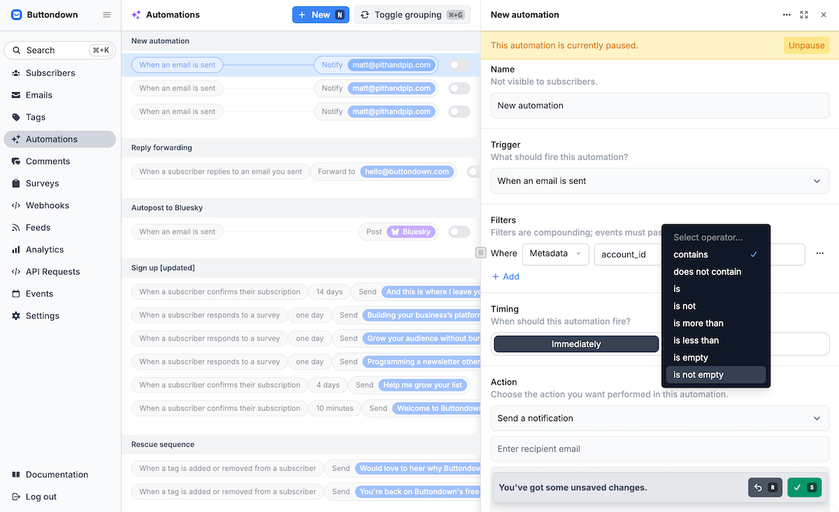Buttondown automations let you build custom onboarding emails, filtering for specific bits of metadata