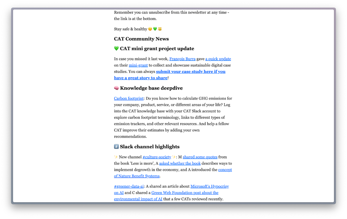 The ClimateAction.Tech (CAT) newsletter does something similar with its Slack community. Each edition includes news, blog posts, podcast episodes—the standard content you’d expect in a community newsletter—followed by community-submitted events, open roles from the #jobs channel, and Slack channel highlights featuring recently shared articles, discussions, and questions. Same for The Turing Way Community Newsletter, highlighting meetups, events, and discussion opportunities, each with a unique Slack channel, as a way to guide replies and give every reader an entry point to the community.