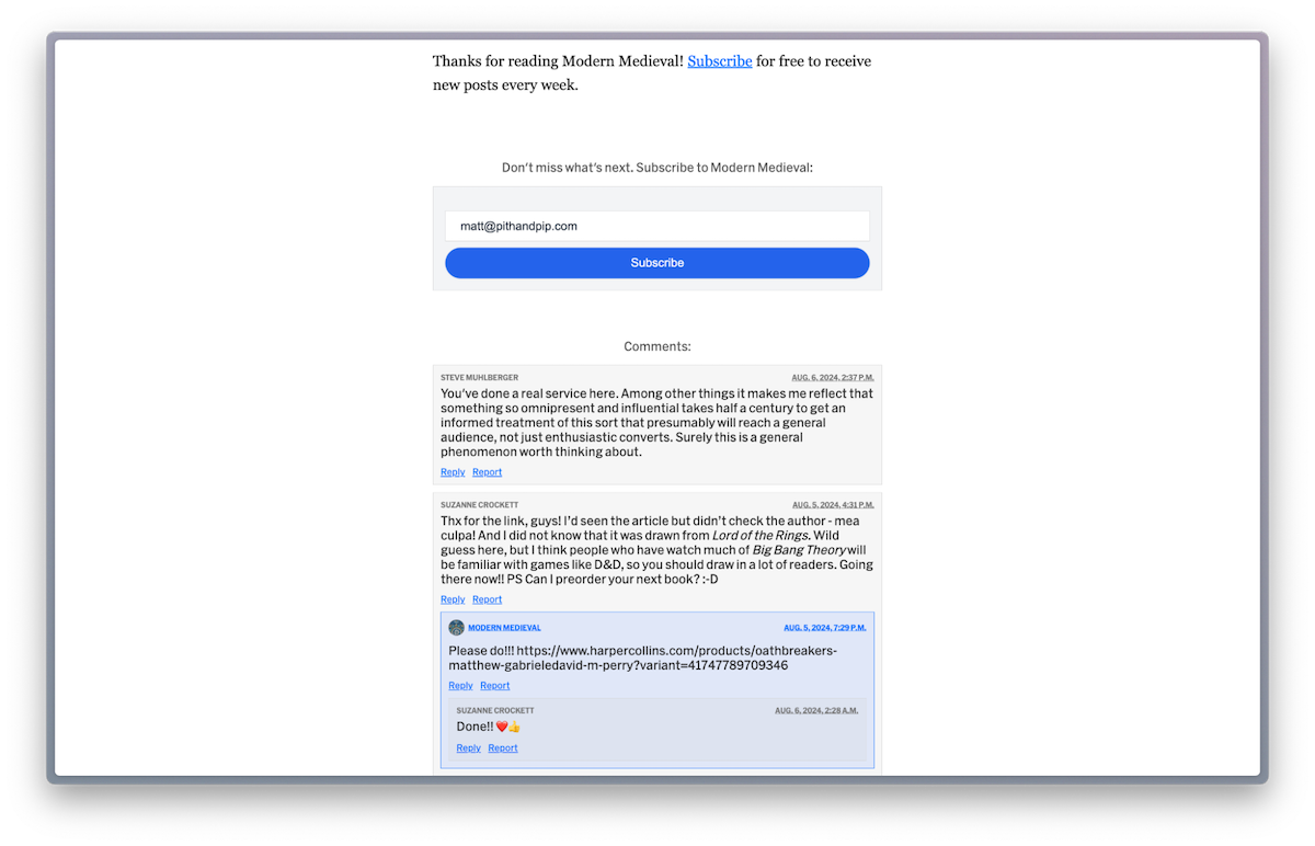 Or split the middle. Instead of building a full community in Slack, Discord, or a dedicated forum alongside your emails, or focusing your newsletter on replies, enable comments on your newsletter archives (here’s how, in Buttondown) and a community can form right alongside your messages. Modern Medieval did that, for instance, and instantly you started seeing a tiny community form around sharing thoughts and anecdotes related to the emails. It’s almost the value of a Stratechery-style forum alongside the newsletter, for zero additional overhead.