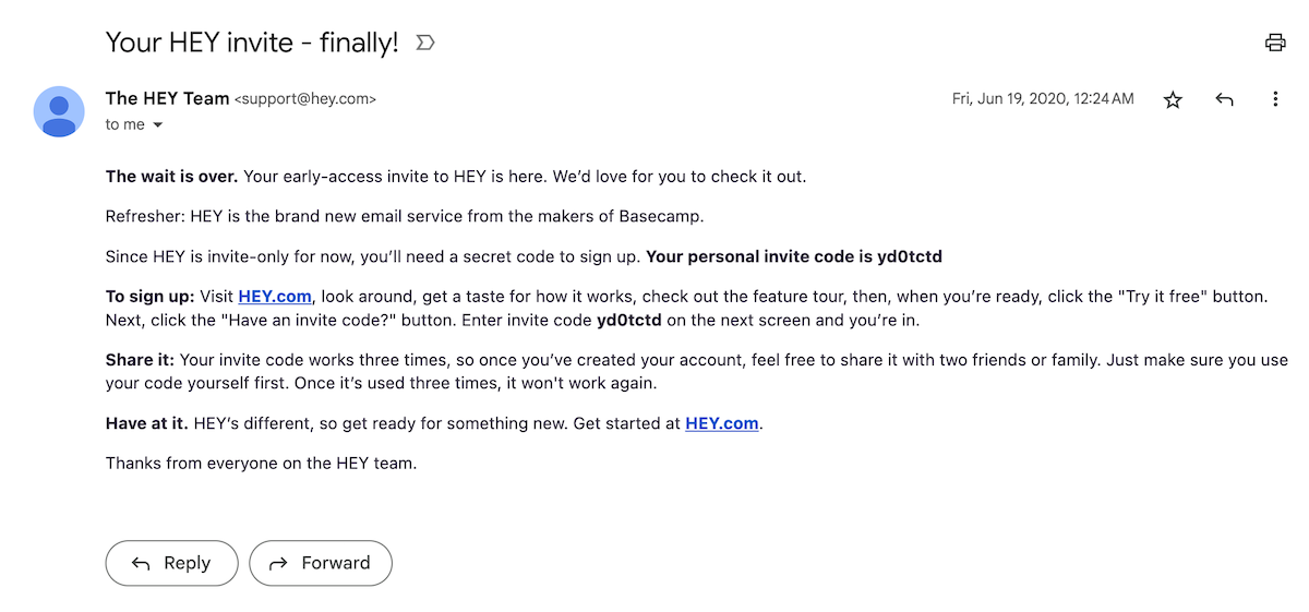 It’s a popular formula. Stripe Billing did it, with a launch email including three bullet points. The Basecamp team went even simpler, launching their Hey email app with a single sentence: “Refresher: Hey is the brand new email service from the makers of Basecamp,” followed by your invite code and signup instructions.