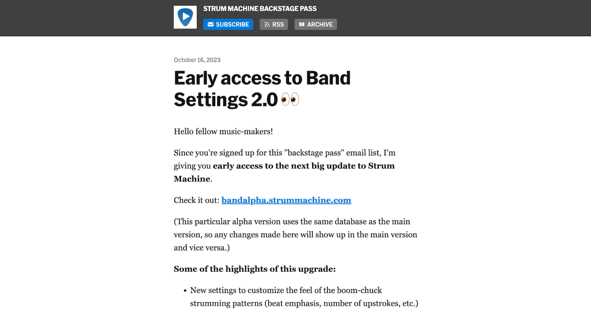 If you have an existing mailing list, you can use it to cross-promote—but here, you have to be even more careful to not overdo it. “People hate cross-promotion of products,” worried the UserMaven team when launching a new product, “so we kept it to the bare minimum (3 emails in total) to get the word out without annoying those subscribers.” Strum Machine balances that with a dedicated “backstage pass” newsletter for their most devoted fans, as a separate pre-launch list for people most interested in their app (and with more frequent updates, behind-the-scenes details, and early bird discounts to match).