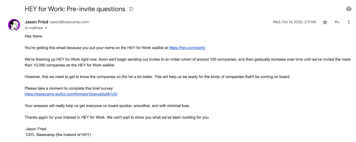 The best time to ask folks and get their participation in what you’re building is pre-launch. The Basecamp team did that before launching Hey for Work, their take on Google Workspaces, with a survey about the types of companies most interested in their email service. And as I was writing this piece, another pre-launch app emailed, with questions that presumably will help shape their product’s focus.