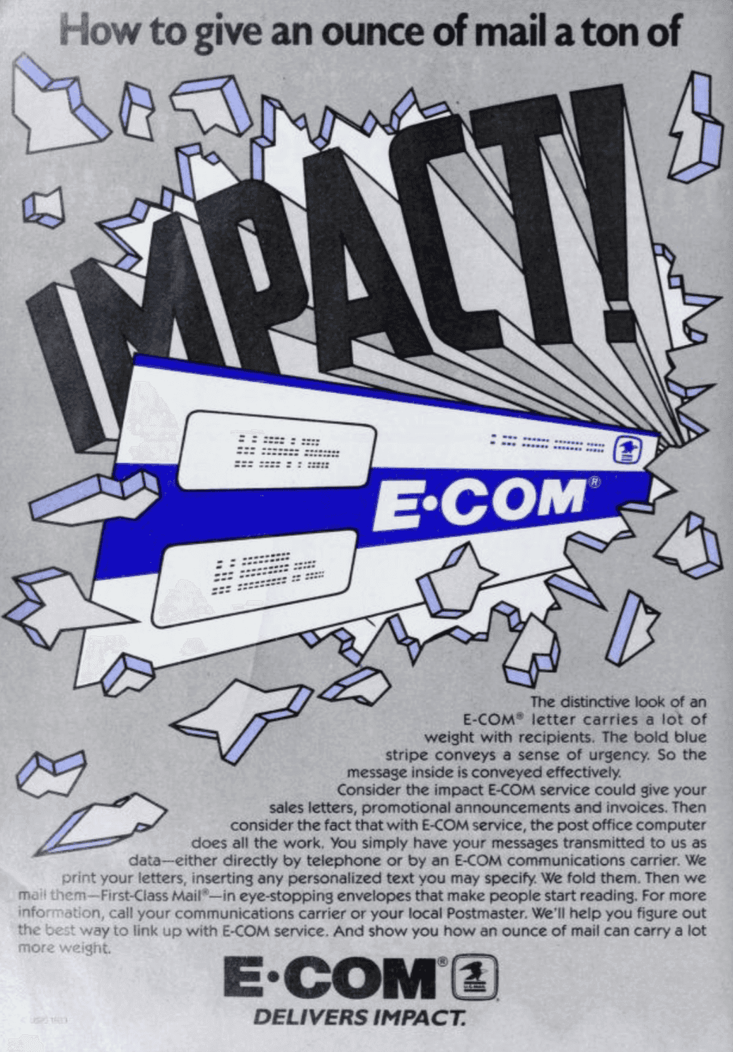 Some early adopters braved the challenges and took the Post Office up on its offer. With their official-looking, blue-and-white envelopes, “an E-COM letter carries a lot of weight with recipients,” advertised the USPS. Bank of America used E-COM partly to expedite overdue payment notifications, partly because the envelope “draws attention,” said a bank official.