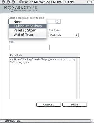 TrackBacks started life with a bookmarklet. When you read something interesting, you’d click the bookmarklet for your blog and if that blog supported TrackBacks, it’d copy the link and give you a space to start blogging. And when you clicked Post, your new blog post would be published and your site would notify the original site about the post. A bit manual—but not much more than quoting a Tweet and adding additional commentary today.