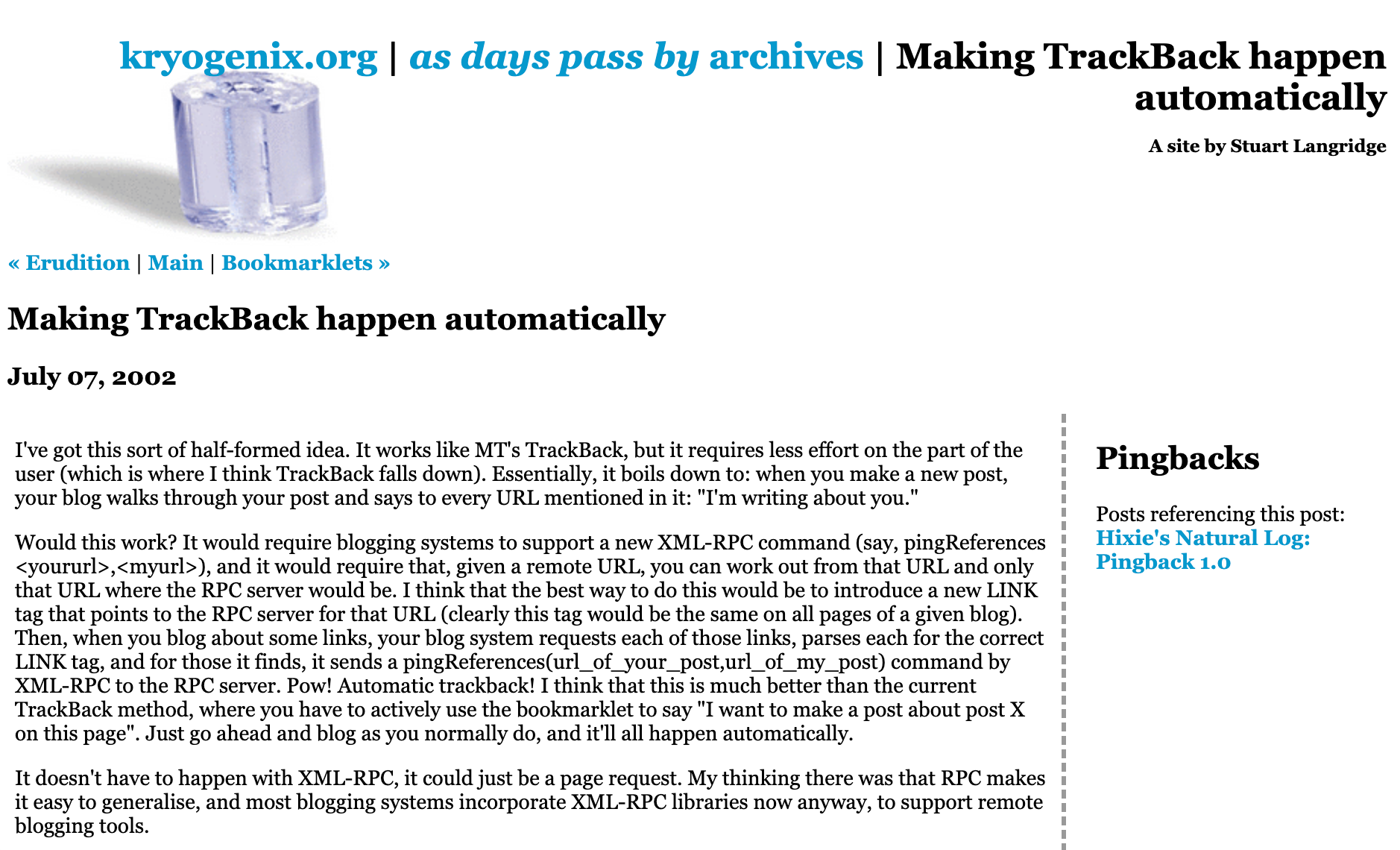A month after TrackBacks launched, Stuart Langridge had a better idea. What if the servers just automatically notified each other? “When you make a new post, your blog walks through your post and says to every URL mentioned in it: ‘I’m writing about you,’” suggested Langridge, using XML-RPC commands to ping the server. By September, an official spec was born, christened Pingback. If your site supported Pingbacks, you’d included a <link rel="pingback" href="https://domain"> in the head. Whenever a blog post mentioned you, its software would scan the header, find the Pingback link, and ping it with details about the new post.
